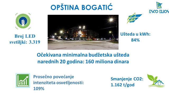 2020.godina je za opštinu Bogatić započela realizacijom projekta zamene starog javnog osvetljenja sa novim i efikasnim LED svetiljkama. Projekat od samog početka lokalnoj samoupravi donosi finansijske uštede i pruža ravnomernije i efikasnije osvetljenje.